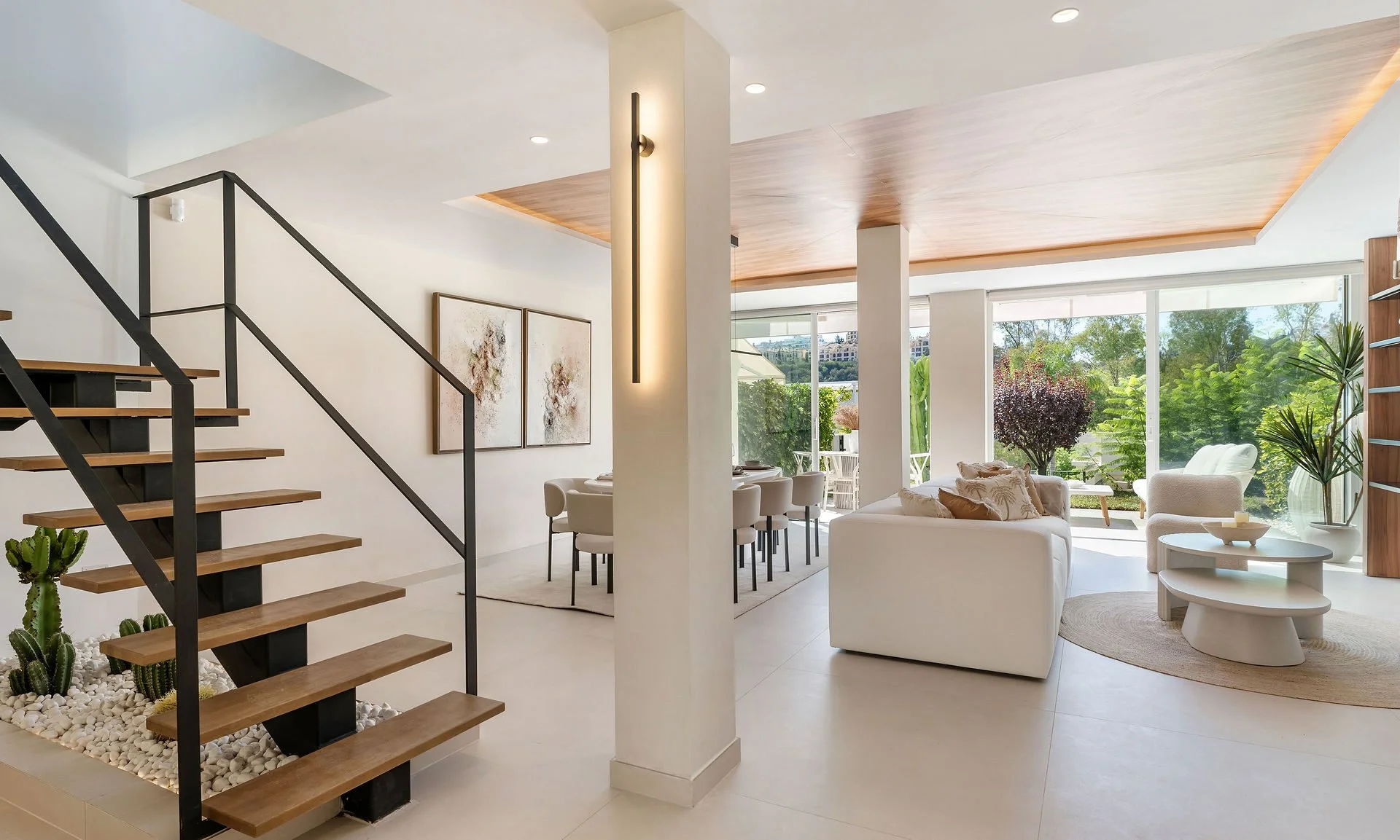 Located in the peaceful residential community of La Quinta Hills in Benahavís, this modern townhouse combines Scandinavian-inspired design with Mediterranean warmth, offering open views of the sea and surrounding mountains.